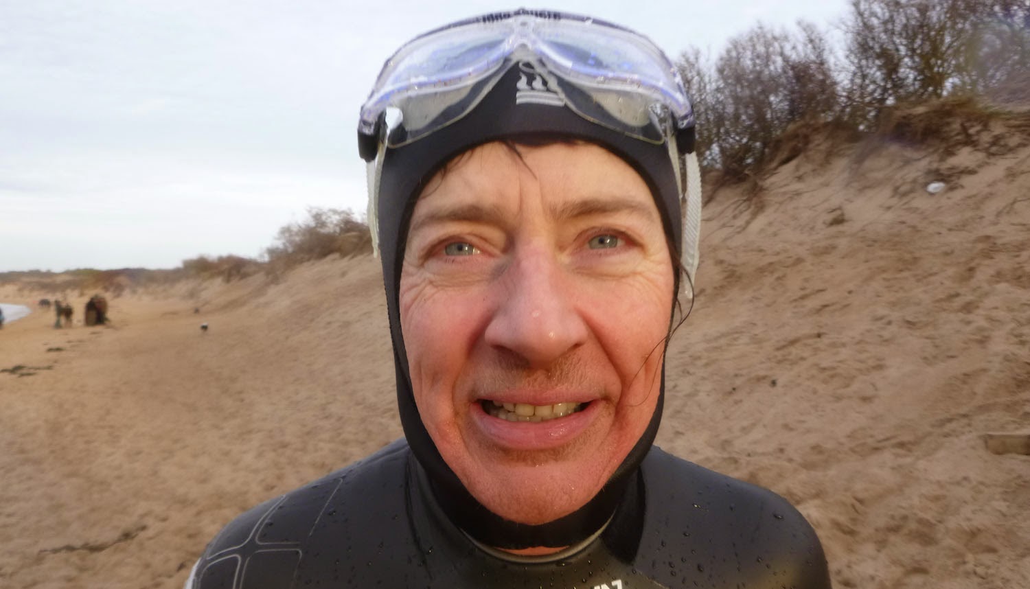 When we got out I was taking photos of Mary and happened to look incredulously at her mouth. I couldn't remember her sporting such a moustache and beard combo before we got into the water, and she wasn't exactly delighted about me pointing it out. My brain, in a state of hypothermia couldn't quite work out how she might have produced such luxuriant dark growth in just 15 minutes and I wondered was it perhaps a chemical reaction like dyed hair going green in chlorinated swimming pools? We ran up to the car park where still the Movember look perplexed me - it was like one of those iron-filings-on-a-line-drawing-of-a-bald-dude games you used to get.