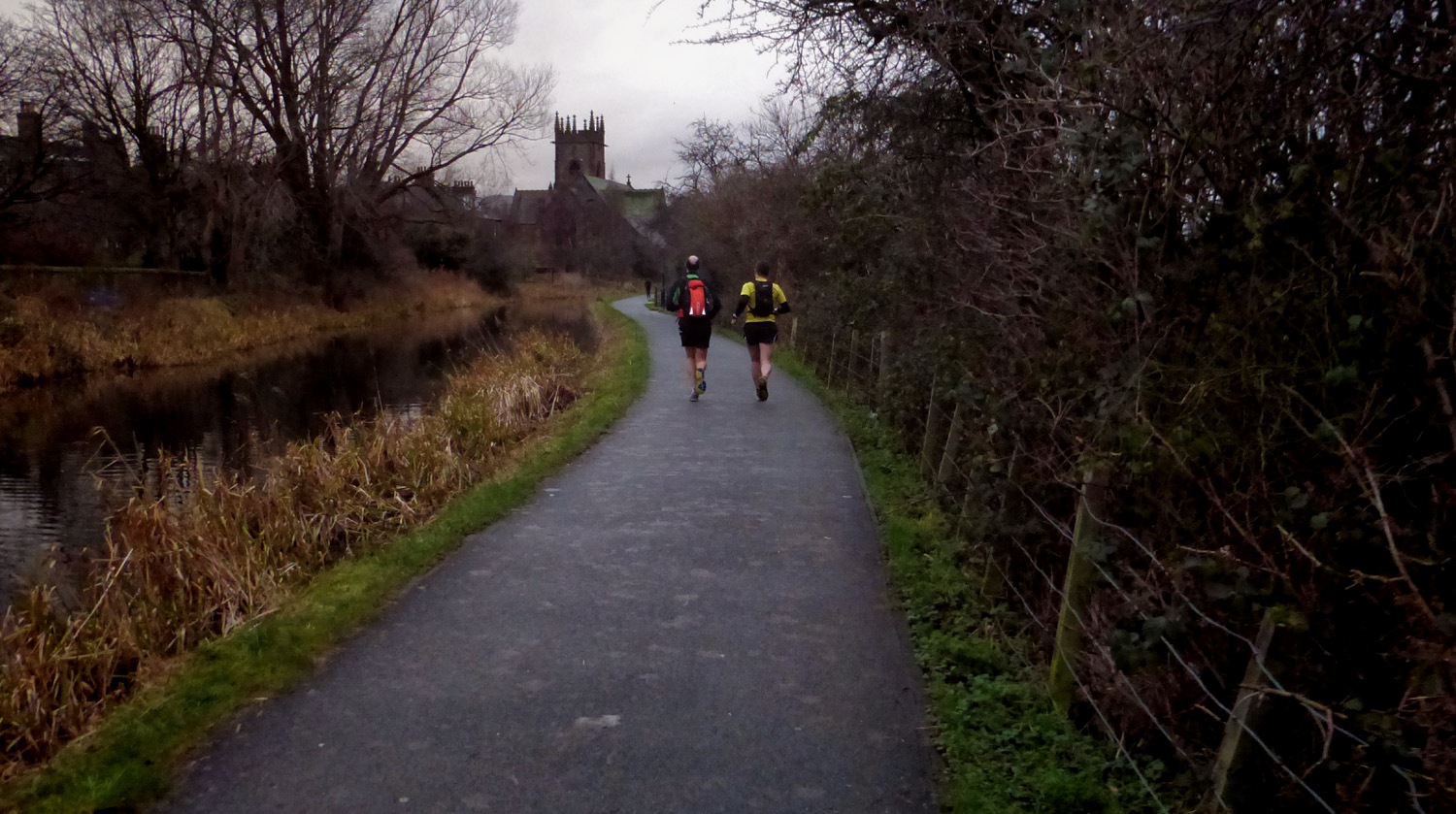 On the upside the cyclepath was quick (not too muddy) and didn't involved much navigation. We had done over 15 miles when I suggested that if there was a suitable spot up ahead we should stop for something to eat. There wasn't a picnic table handy and it wasn't really weather for sitting down outdoors so we slowed to a walk and ate sandwiches. I had the usual honey, cheese and lemon curd. I never have these at work; only when out ultra-ing. I had also taken quite a handful of sports bars and confectionery, none of which I ate at that point.
