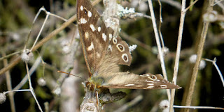 I wasn't even out of the Bents car parks before I got my first first-sighting-of-2017 butterfly. The Ringlet, a modest brown job, was tricky to snap as they flutter about then disappear into the long grass and are reluctant to settle. Females lay eggs by either sitting high on a blade of grass and squirting eggs into the air, or letting go during a stuttering flight. "Bombs away!" This was the first of several seen, but due to their erratic flutterings, the only one I "captured".