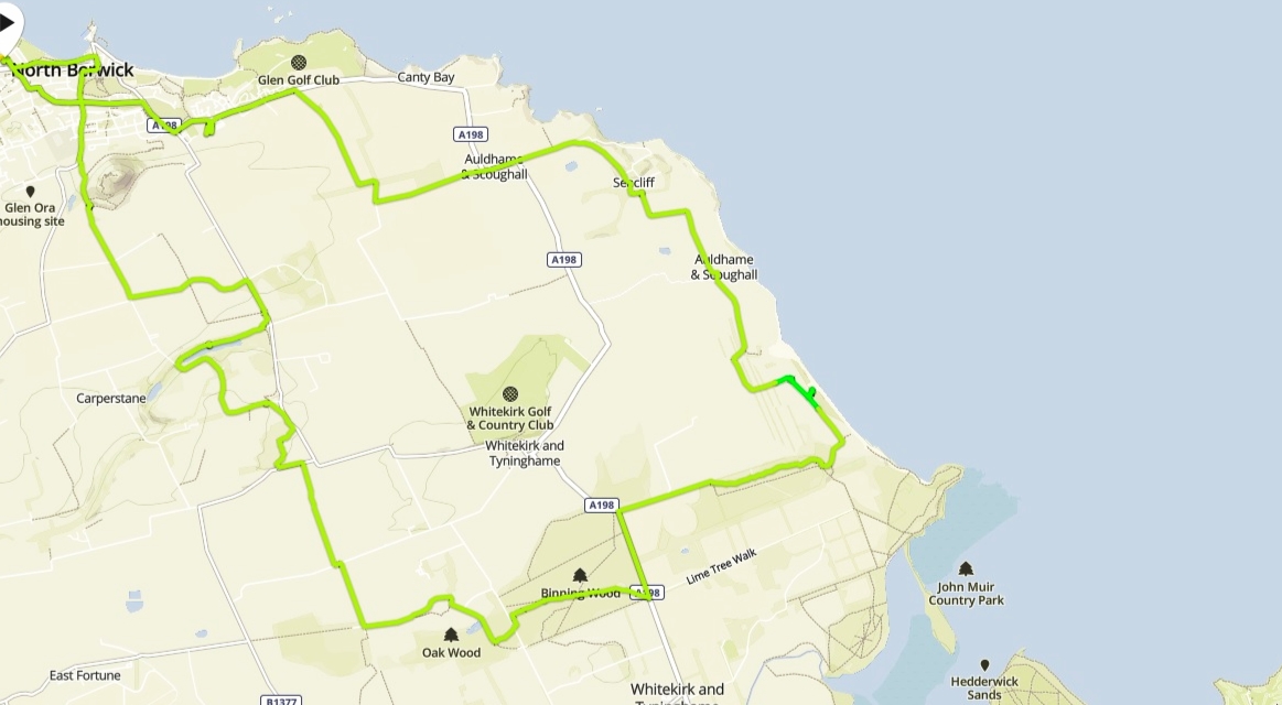 When running this circuit these last 5 miles are tough. You have passed the best scenery and there is just the slog on the roads back into NB. On the bikes it is considerably easier though I seem to have a memory of complaints about hills and lethargy and the warmth of the day. At the top of the hill before Tantallon we went straight on rather than down and round as there is less traffic on those roads. At NB we went into Tescos and struggled to choose between so man ydelicious cold drinks and foods to eat. We were about to have a picnic directly outside but I insisted we return to the car as there were no benches and my legs don't fold in such a way as to allow for sitting on grass. All that fresh air does give you a right appetite though! Lovely day out in a great part of the world.