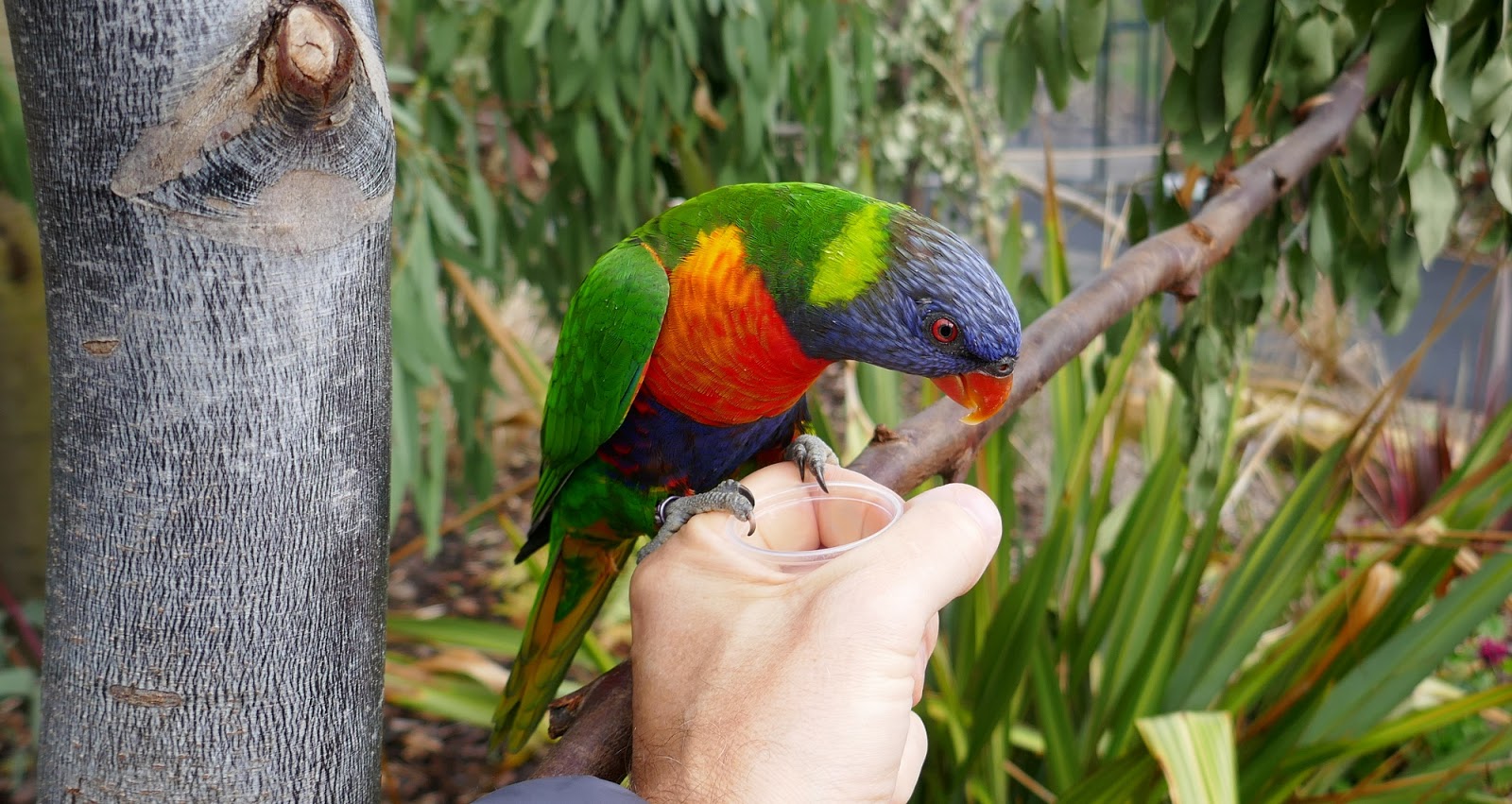 So it starts with a lick then there is a gentle peck and bite. It is not in the least sore and wouldn't break the skin but the zoo are keen to discourage this behaviour and you can imagine the law suits just waiting to happen if it spiralled out of control. So we are told to hold fingers away which was shame as I was just scooping the last of the juice out the cup and holding it up to the birds to nibble. Not allowed! Meanwhile my hand was being cleaned carefully with mostly licks and only occasionally a little nibble. There is video. Below is a still from the video. You can tell I was smitten!