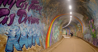 I had heard the Colinton Tunnel was getting a make over. I was impressed that it is actually being done really well. Although a variety of styles there is a continuity and I liked the large text (having done a fair bit of sign-painting in my time) although some of the phrases chosen didn't seem to say much. But it was all very upbeat and struck the right note. And nearly everyone through was admiring it and taking photos. Top marks to those involved.