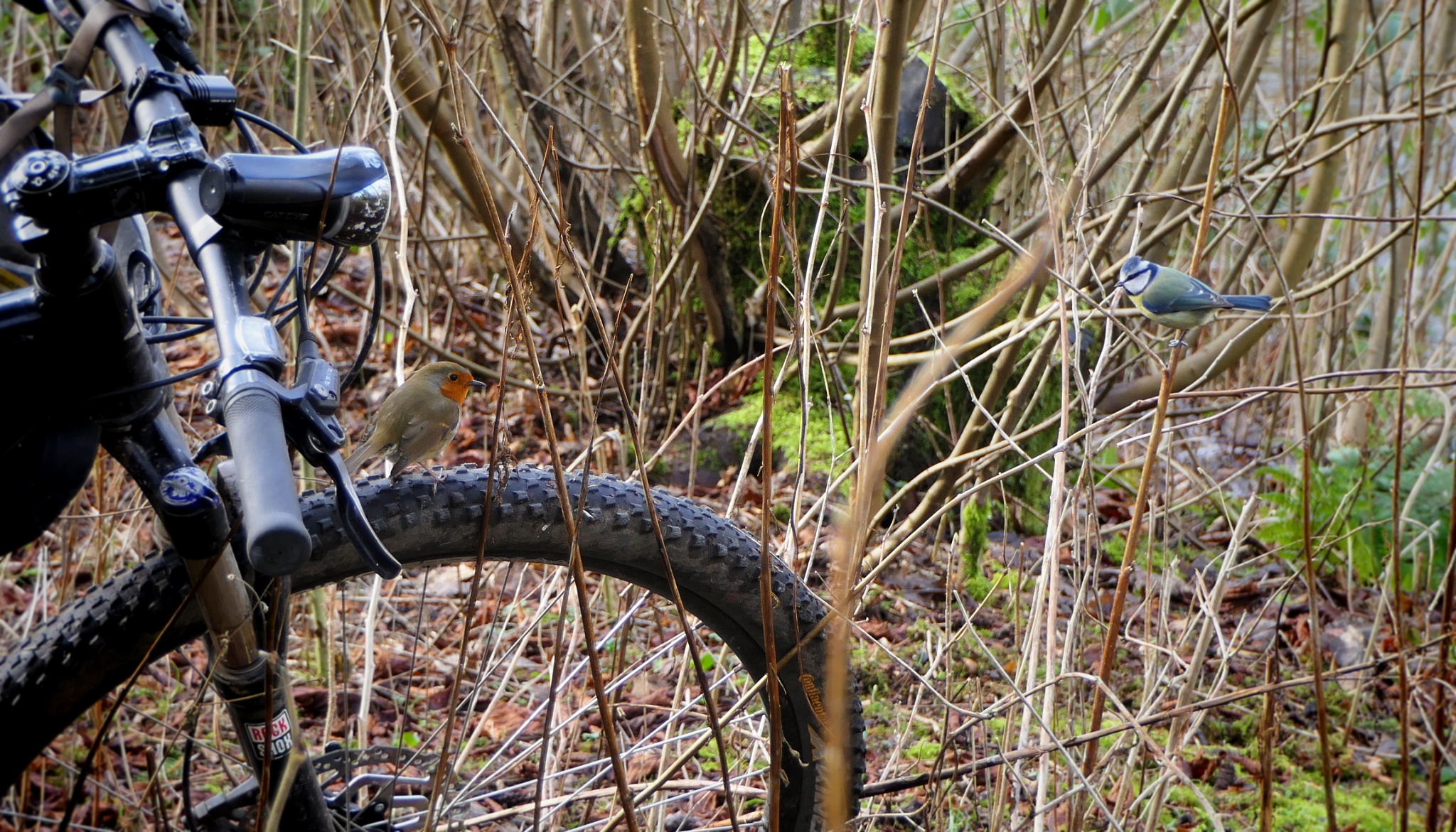 I packed up and pushed my bike round the end of the water and was about to proceed when I saw the JayLady coming back out the brambly path. We got speaking and she said she had been feeding the jays for a while now at that spot and if you stood still they would come close enough to photograph. She denied she had been hand feeding them. But being a bit further away from the main path it meant there were fewer distractions and interruptions from all the inconsiderate dog walkers and squawking kids. She seemed to do this as a destresser and posted on Instagram rather than facebook. After a friendly chat she left and I pushed through the scrub trying to see where to place bait. It was not as obvious as the first spot. Although there were some flat trunks on the ground I put seeds and bread on any surface that looked likely. Then stood back. And waited.
