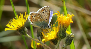 There is a little inlet which I always check for dragonflies. There was an older couple there (telescope for birds and butterflies) and we chatted briefly. I was saying how I'd seen broad bodied chasers the day before near Haddington and the woman said yes, you get those in Devon. Which reminded me of my grandfather's old chestnut, "If we had ham, we could have ham and eggs, if we had eggs." In as much as you get a lot of things in Devon if you are there, which clearly we are not. So instead of any further tales from the dementia ward, I chased after this very active common blue which was sprinting between but actually settling on dandelions round the edge of the watery inlet. It provided more interesting photos in the bright sunlight than the previous model or the 4 spot chasers which buzzed about randomly. I felt they were the first decent common blue photos of the year I'd taken.