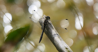 In the absence of the 4-spotter this black darter turned up and did a fantastic job of posing right at the end of another pond-side stick. It wasn't spooked by me standing just a metre or 2 away and moving to the exact spot for maximum bokeh balls. It flew off and returned several times. I shot some stills and then about 30s of video. Perfect!