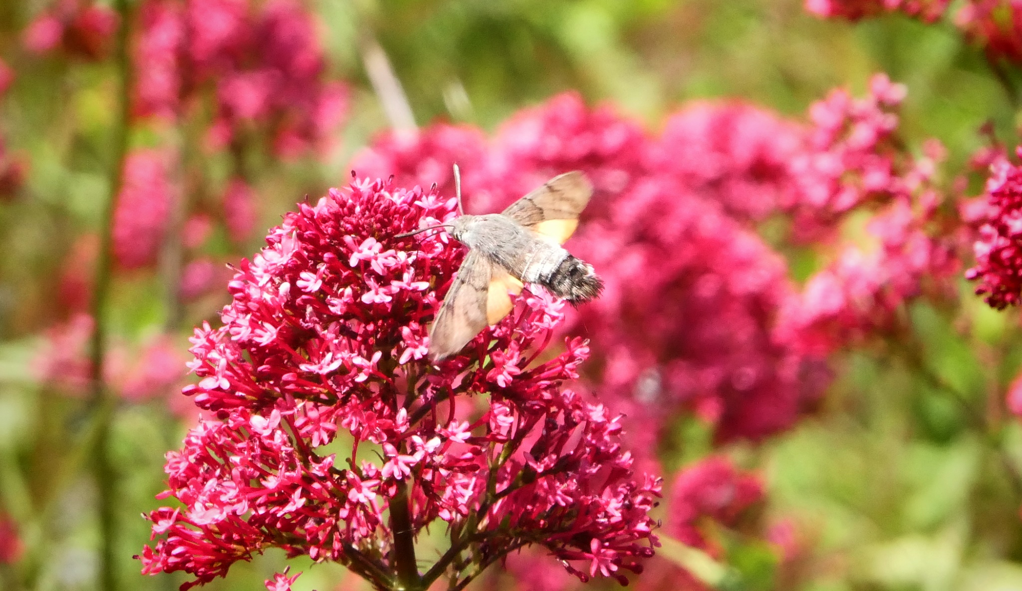 Then the humming-bird hawk-moth turned up. They move like a humming-bird more than a moth so are unmistakable. They give no warning when they are going to turn up and sometimes stay seconds, sometimes minutes. Most of the photos taken are deletes but occasionally you get lucky. I have tried high shutter speeds for less wing movement but haven't noticed any real improvement over lower speed (blurred wings) and better iso.