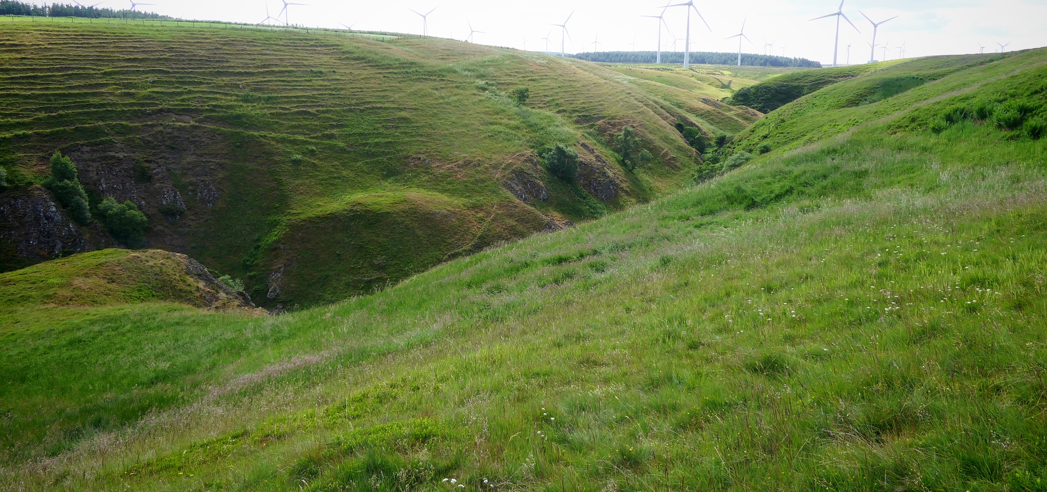 I asked the bus driver about dropping me at the layby atop Soutra and I think a more relaxed one might go for it, but the one who drove me said he couldn't as the layby might be in use by lorries. (It wasn't.) However it is less than a mile from the Gilston Road end official bus stop to the layby at the top, and easy uphill walking on grassy roadside verges. Again the proximity of heavy traffic roaring past without much to stop it careering off the road and mashing you into the ground is a risk you'll have to take. None mashed me during the 20mins I was there. Then, with a lighter heart you scurry over a style past a fence and down into a rather beautiful gorge, carved by a small stream.