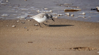 Mary kept pushing on while I stopped to interview the sanderlings. I think there were only three or four in total but they were reasonably behaved and came quite close to where I was standing with the compact camera. I took dozens of shots knowing the hit rate is low with the compact at full reach. The great light helped and the results weren't too bad. However I have now got used to excellent quality images from the G9 and so everything else kinda sucks. Meanwhile Mary was disappearing over the horizon at the other end of the beach. I upped the pace and caught her nearer Gullane Point.