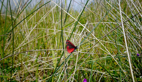 Chasing butterflies on the beach. Well, neither. They were moths, and they were on the machar or the sandy grasslands between the beach and the road. I thought they might be related to the Six Spot Burnet: a daylight moth you get there in July as they were a similar colour with bright scarlet underwings that would flash as they flit through the grasses and dodged the camera very successfully. They were Cinnabar Moths, another daylight species.