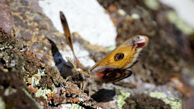 I was taking photos with the macro lens. The moths will sit for a short while and are too busy warming up to care about a camera in their face. Each one behaved differently. Some were off in a handful of seconds, others were a bit sleepy and were happy to sit in the sunshine a while rattling their wings to warm up their motors before flying off. The slower ones gave me time to get close-ups of wings to the point where I could see individual scales. You'd only get this chance otherwise on dead specimens were it not for the lures, and I was thinking about the Victorians etc and their propensity for studying and collecting things by killing them and mounting them in cases. I feel guilty about the false promise of a lure and wasting up to ten minutes of these creatures lives, trapping and cooling them. I doubt the vegans would approve. They appear to fly off unharmed and I quit the process and the top of the hill after about 40minutes in order not to draw too many male moths from all over, to a suboptimal spot.